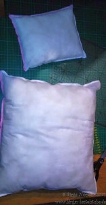 Da die Decke und das Kissen keine Inletts hatten, habe ich als 1. aus einem 80 mal 80 cm Kissen von Ikea 2 Inletts genäht. dazu habe ich den Vlies des Ikea-Kissens passen zurecht geschnitten, gefüllt und mit der Overlock einfach zugenäht.