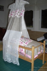 Das Bett fand ich in einem Second-Hand-Laden und hatte mich darin sofort verliebt. Allerdings gefielen mir der Himmel und die Bezüge nicht und so habe ich das Bett neu benäht.