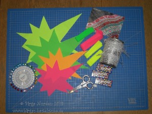Jetzt alles ausgepackt, die Neonstoffstücke haben sich als Aufnäher entpuppt und dazu gab es auch noch passendes Neon-Schrägband und ein paar Smarties waren auch noch mit in der Dose.